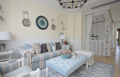 客厅里采用浅蓝色碎花壁纸,清新自然,让人在夏日里感受到一丝丝清凉。浅蓝色会让人感觉空间更明亮,而碎花的图案会让客厅更添亲切感,温馨而又舒适。搭配简洁的沙发、单纯的色彩和质朴的风格让居室呈现出一种理性之美,回归纯朴自然之风。